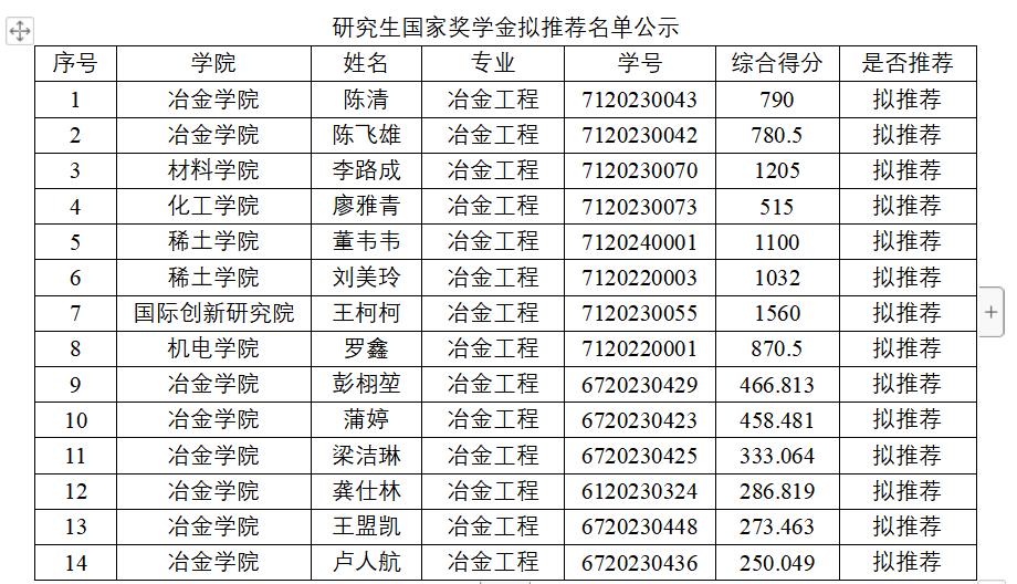 根据学校研究生工作部《关于做好2025年研究生国家奖学金评选工作的通知》,由冶金工程学院组织的博士研究生国家奖学金评选名8个,硕士研究生国家奖学金评选名额6个,共14个。根据学校研究生院《关于做好2025年研究生国家奖学金评选工作的通知》、《江西理工大学研究生奖助学金管理办法》等有关文件要求,参照《冶金工程学院2025年研究生国家奖学金评选细则》的相关标准,经学生个人申请,学院初审、复核、答辩等程序,冶金工程学院2025年研究生国家奖学金拟推荐以下14名研究生,其中8名博士研究生,6名硕士研究生,详细名单如下: