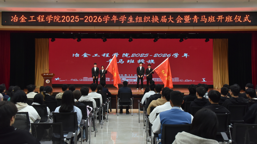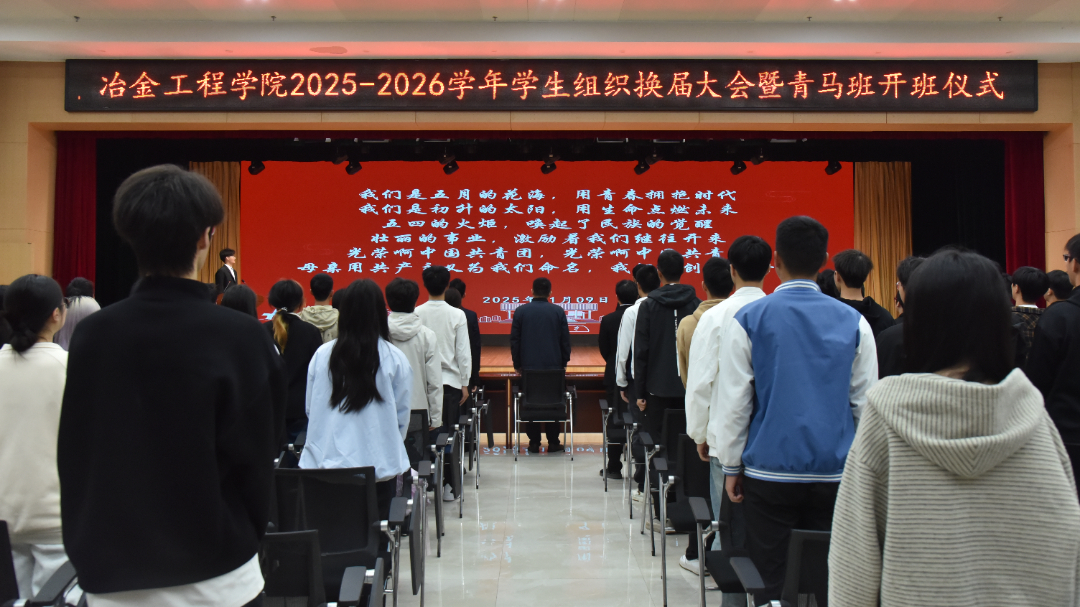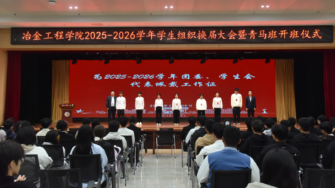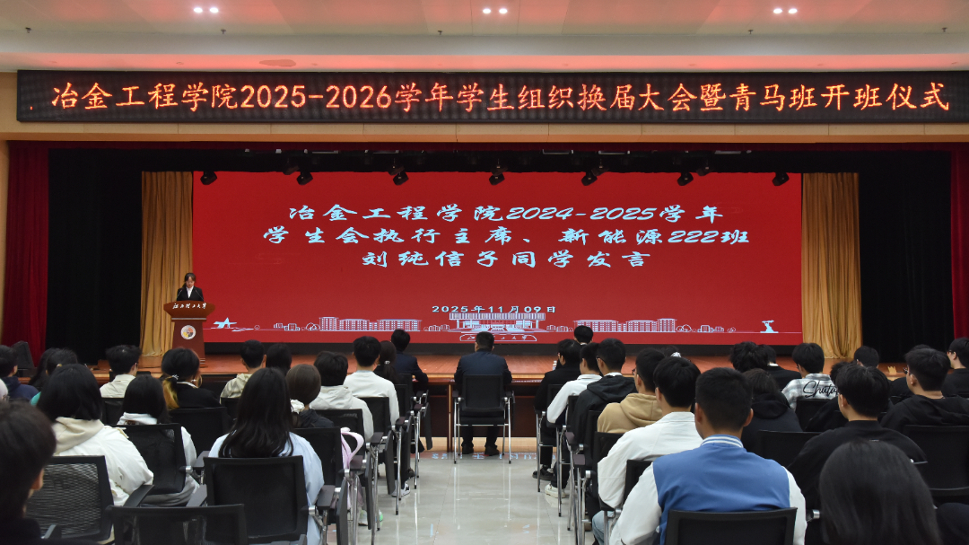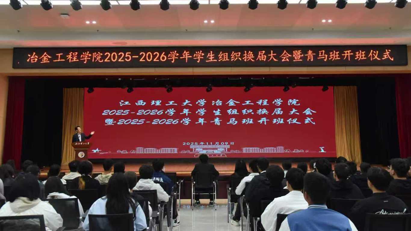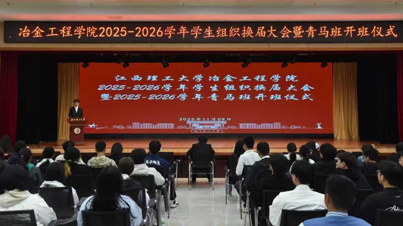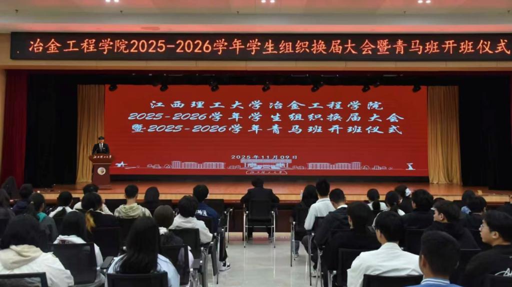 2025年11月9日上午,江西理工大学冶金工程学院在三江校区(东园)三实楼一楼多功能厅隆重举行2025-2026学年学生组织换届大会暨青马班开班仪式。学院领导、辅导员、校学生会代表、学院团委学生会全体成员及新一届青马班全体学员齐聚一堂,共同开启新征程誓将续写新辉煌。
